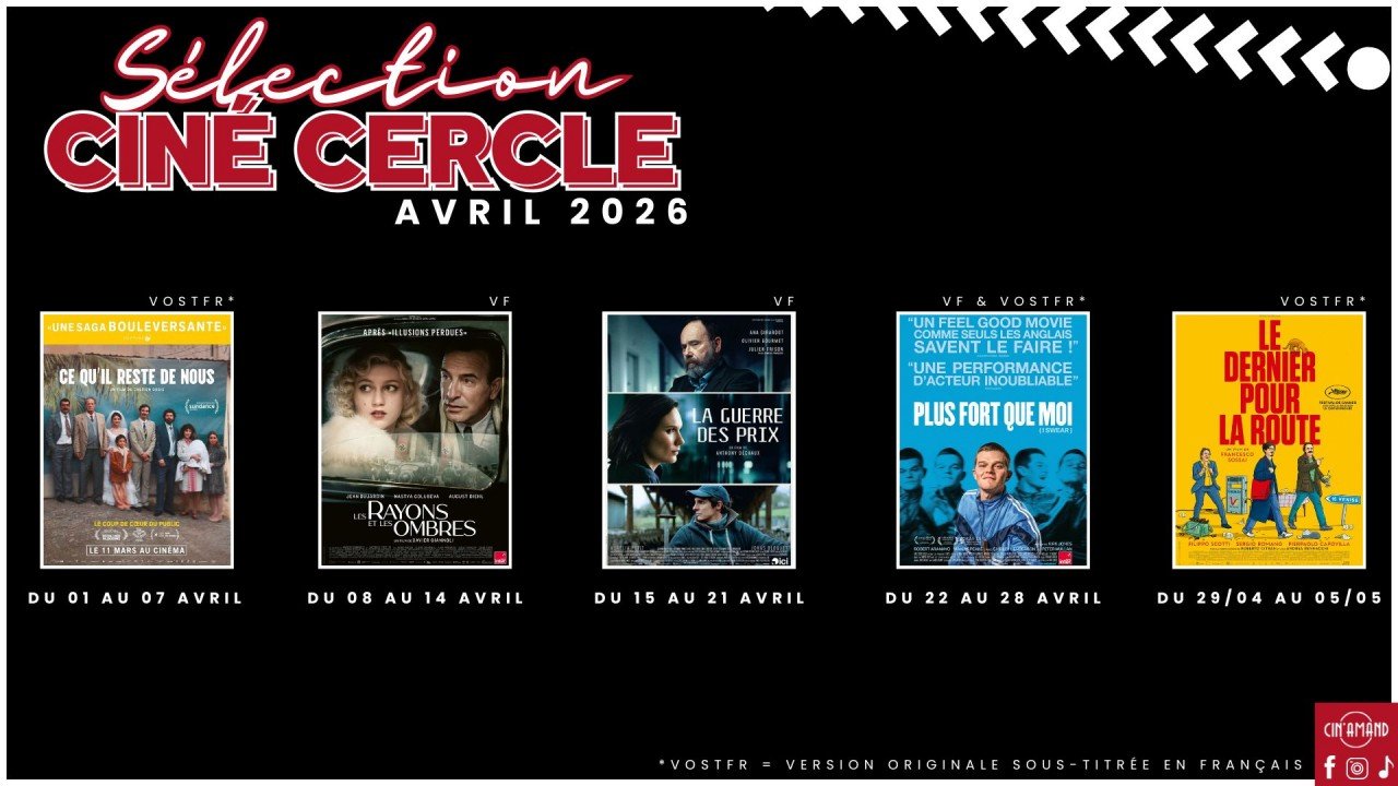 Le CinéCercle est le nom donné à une sélection de films qualitatifs, diffusés en décalé au Cin'Amand. Les films sont accessibles à tous, sans conditions ( autre interdiction CNC ), au tarif qui vous est associé habituelement.